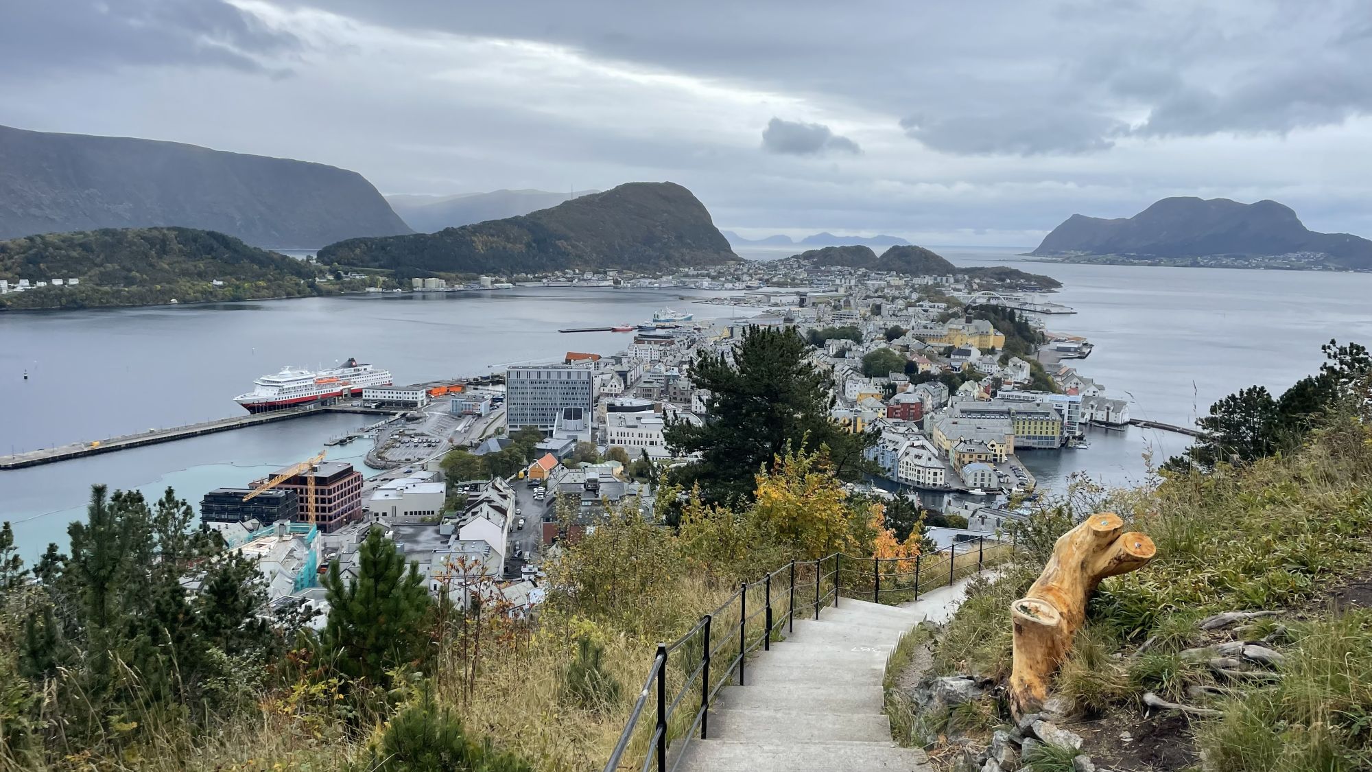 Die schmucke Jugendstilstadt Ålesund empfing uns leider etwas verhangen und nieselig. So war es ganz gut, dass wir erst einmal einen geführten Stadtrundgang gebucht hatten. Denn sonst hätten wir es uns vielleicht einfach schon am Vormittag an Bord gemütlich gemacht. Die kleinen Jugendstilornamente und architektonischen Besonderheiten sind ohne fachliches Wissen kaum zu erkennen, aber so wurde unser Blick hier und dorthin gelenkt. Nach Ende des Rundganges kam dann auch endlich noch ein wenig die Sonne heraus und wir sind auf den Hausberg Aksla spaziert. Über 418 Treppen geht es in Schlangenlinien den Berg hinauf um den berühmten Ausblick über die Stadt zu erhaschen. Toll!